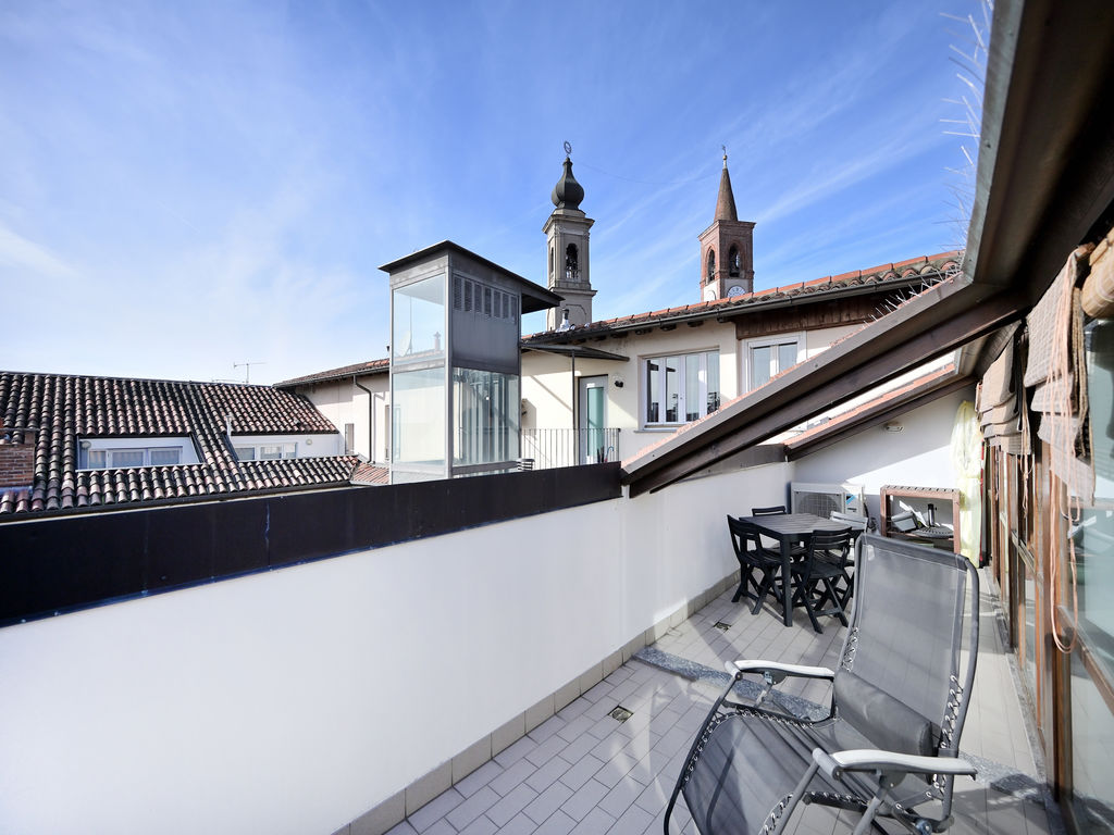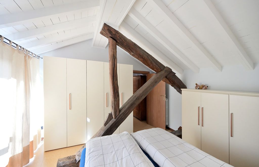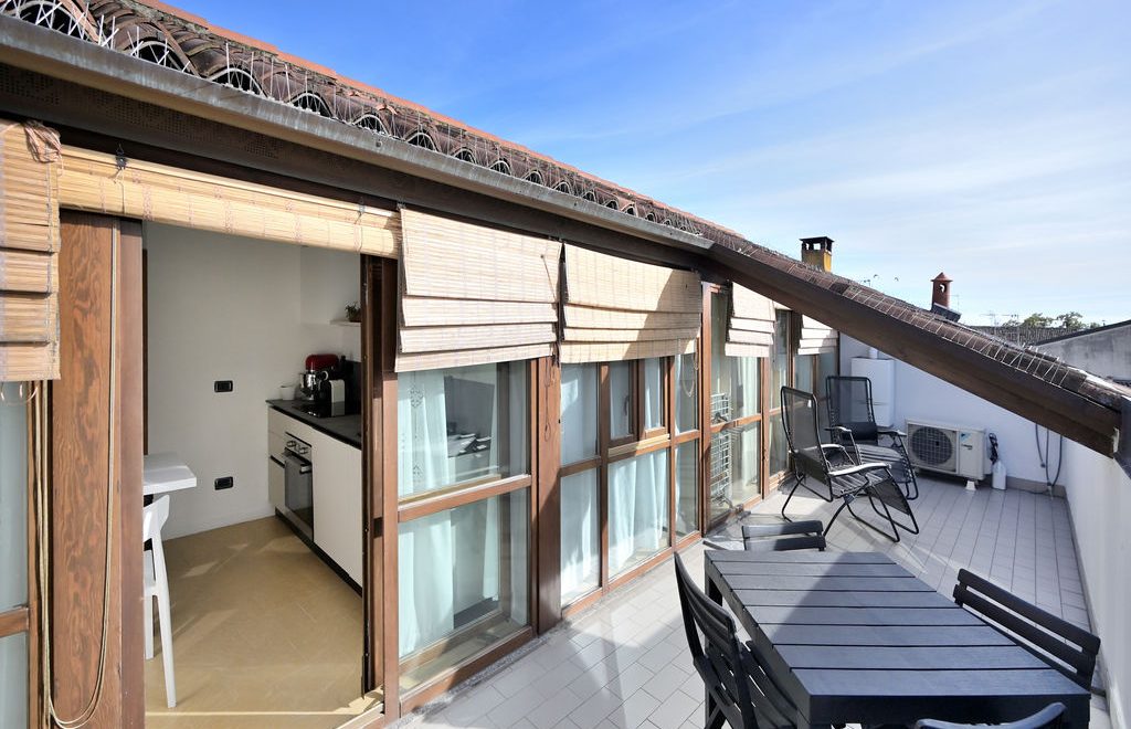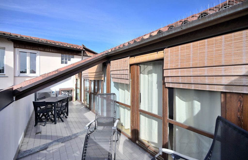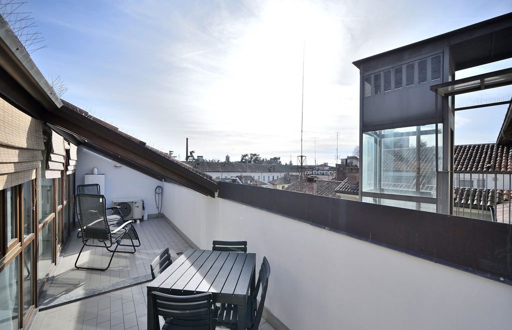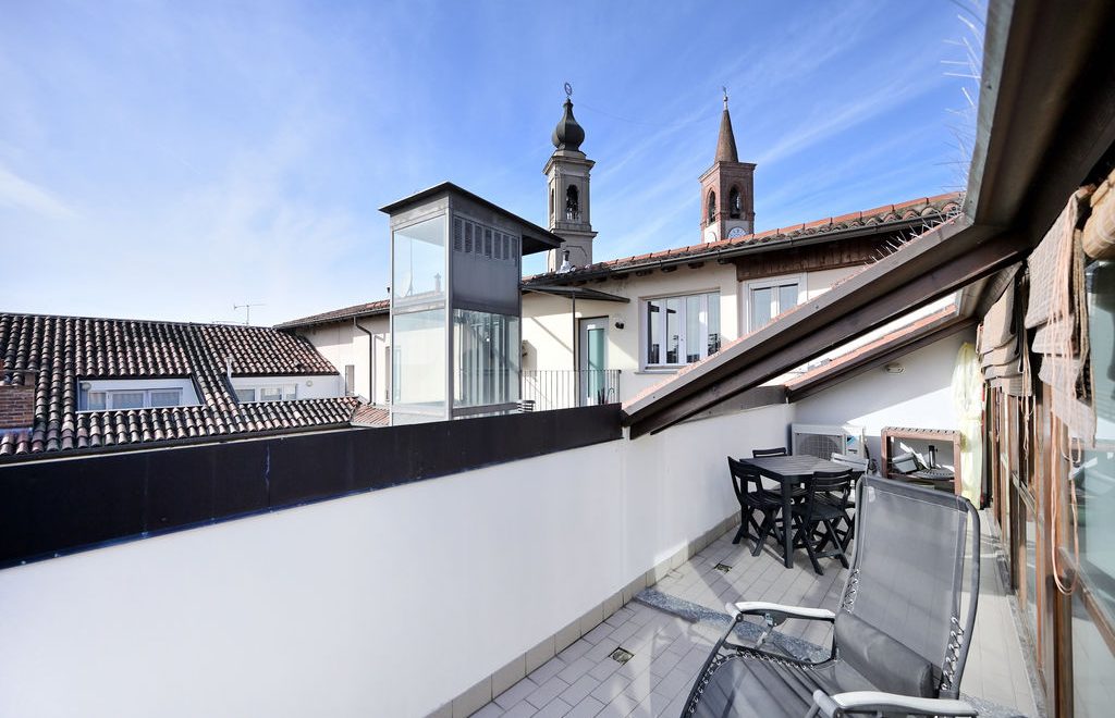 L’elemento scenografico di questa appartamento è sicuramente il terrazzo, molto grande, ricavato a tasca nel tetto, con affaccio sui tetti in coppi antichi del centro storico e con vista diretta verso i due campanili simbolo di Abbiategrasso.