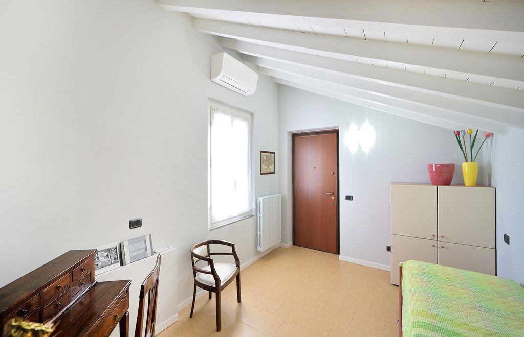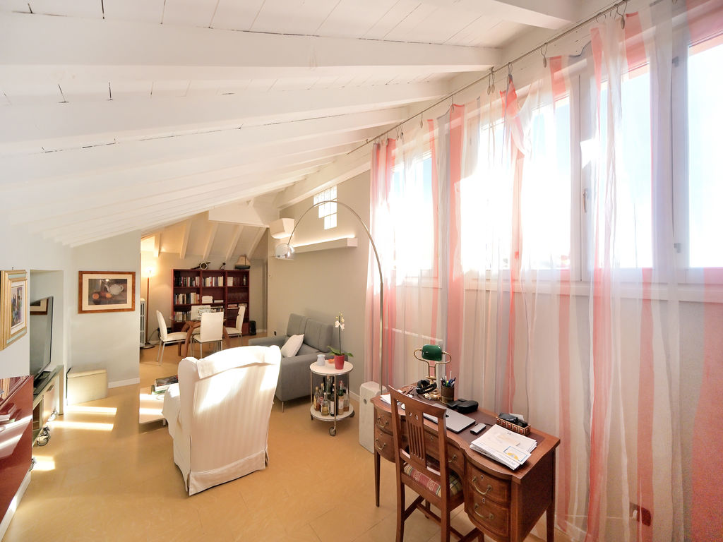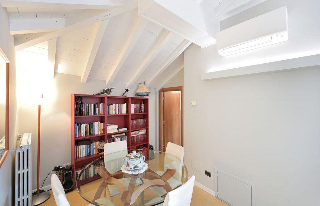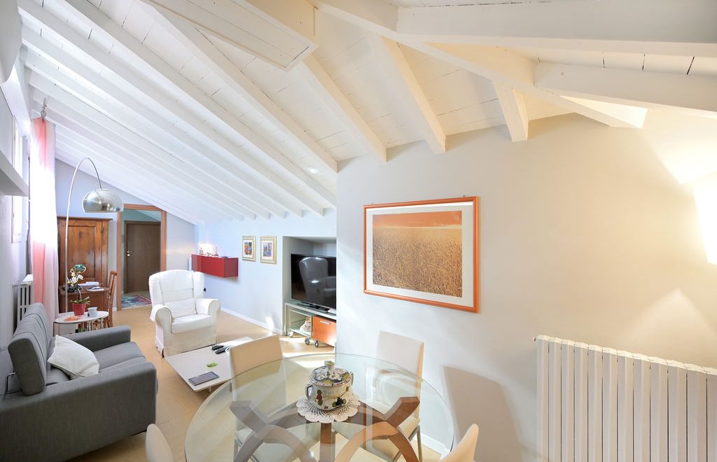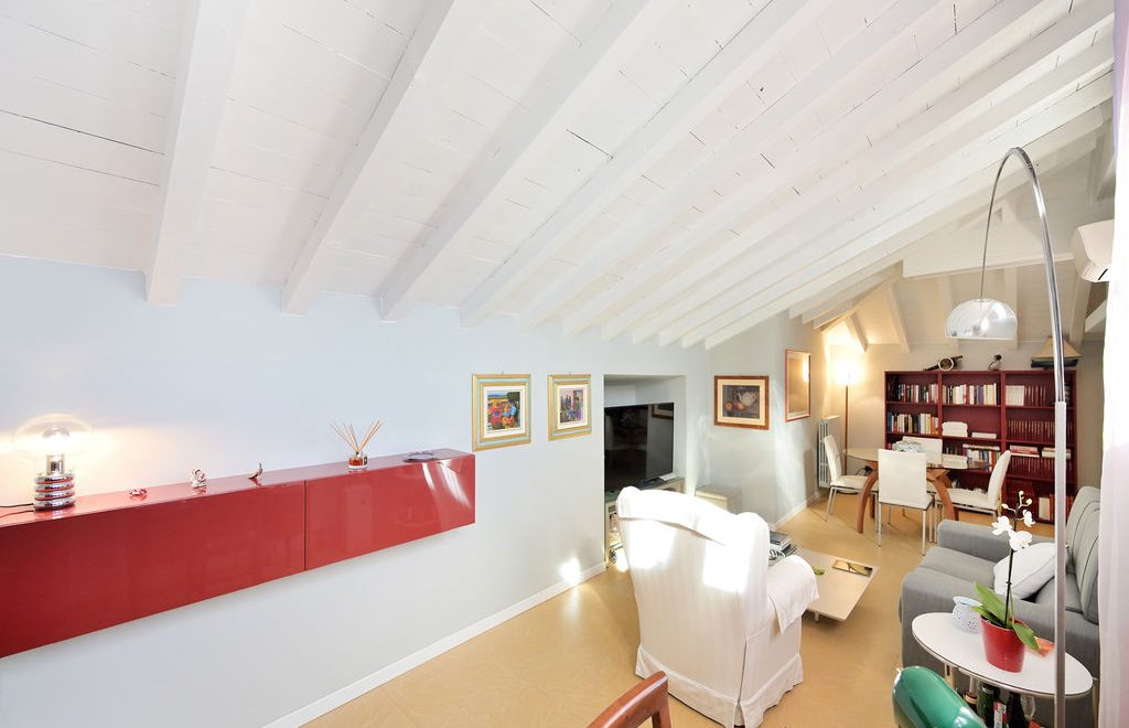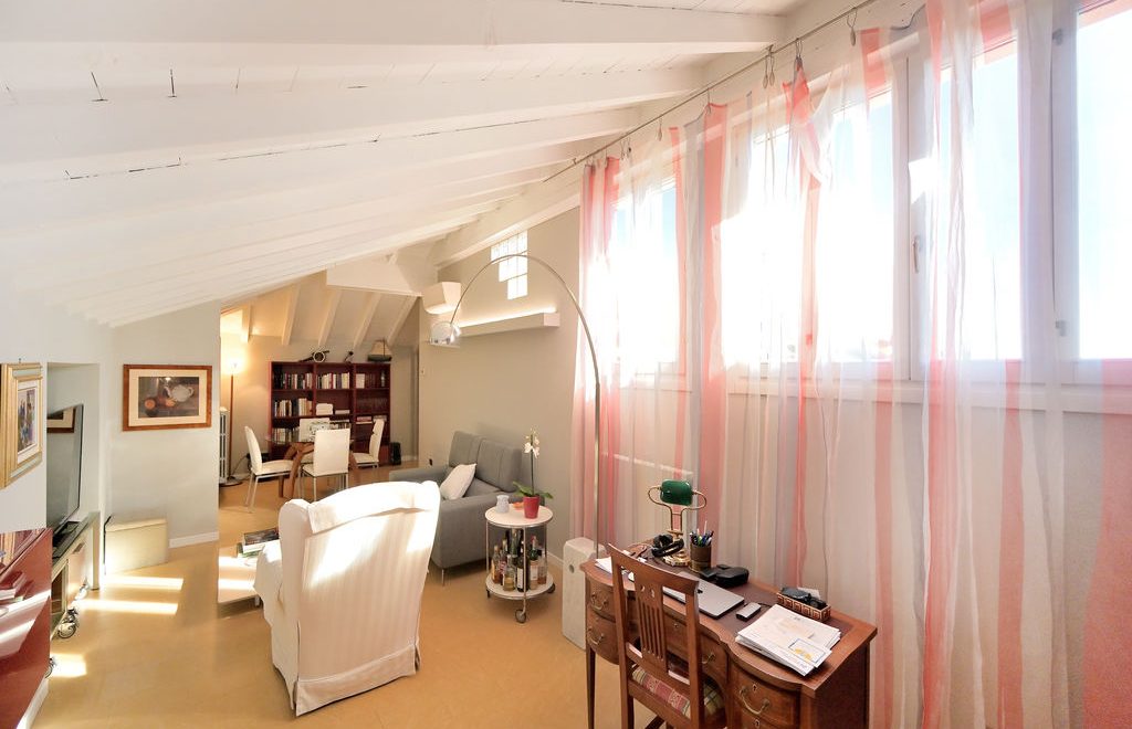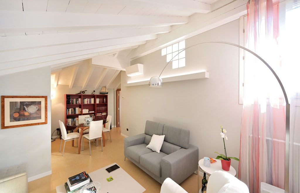 All’unità si accede attraverso un comodo ascensore vetrato che porta direttamente all’ingresso ed al grande soggiorno, caratterizzato da soffitti lignei a vista sbiancati ed accoglie, oltre alla zona living con divani, poltrone e TV anche un tavolo da pranzo.