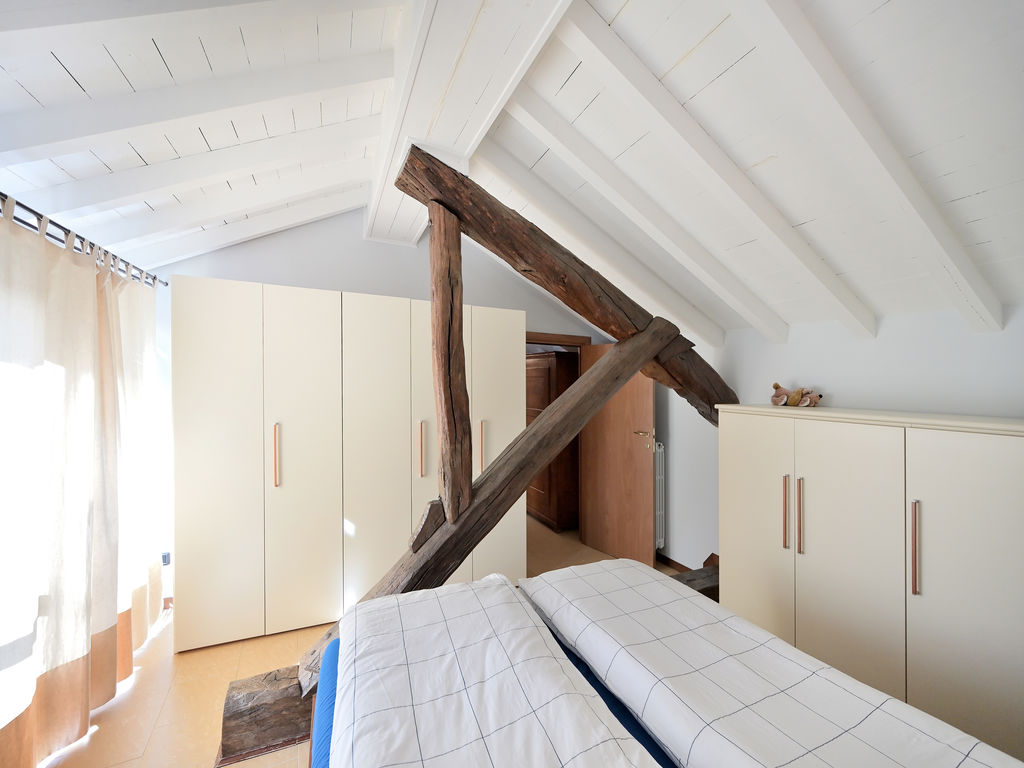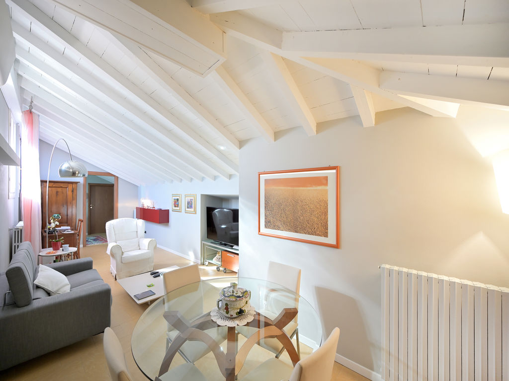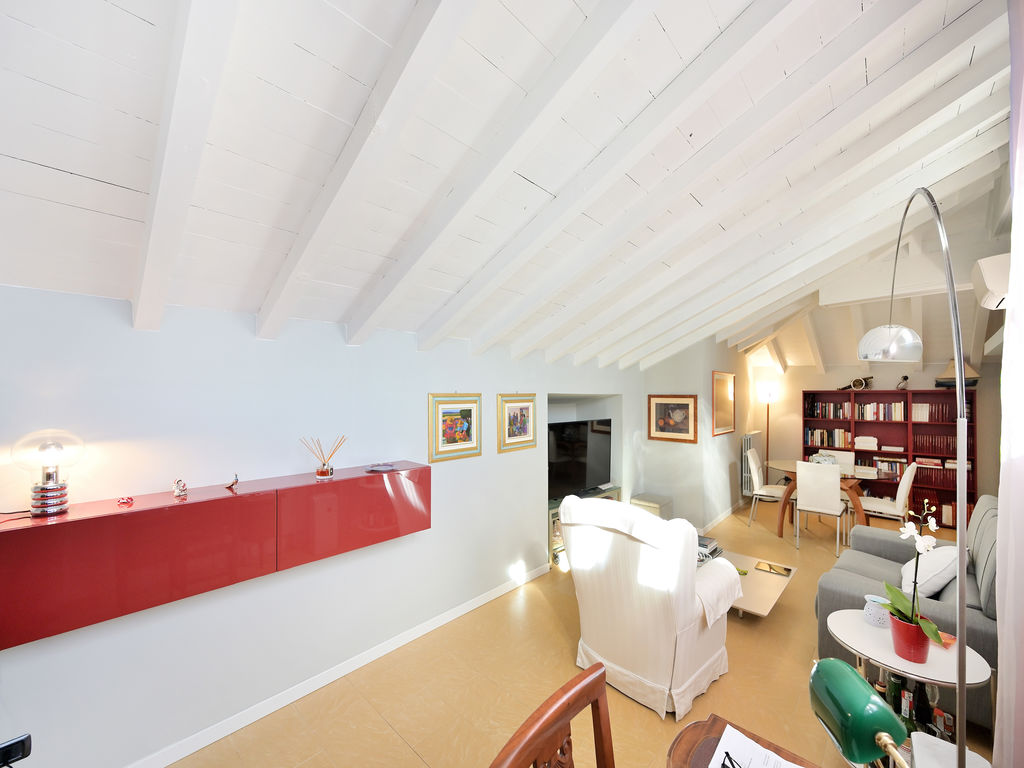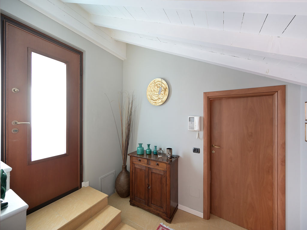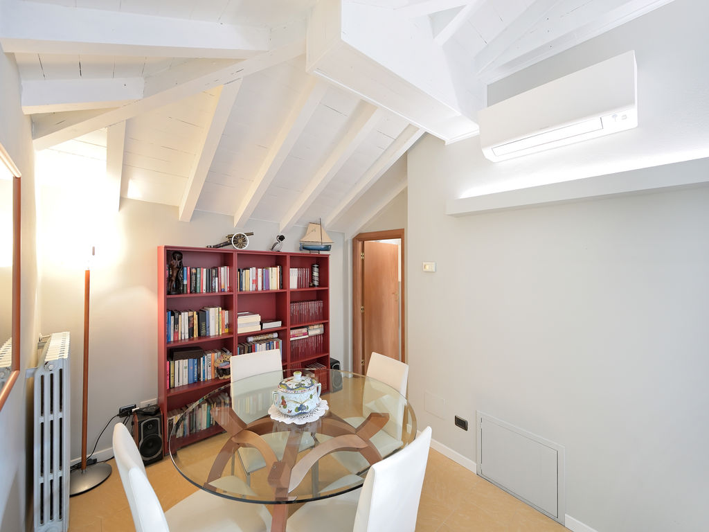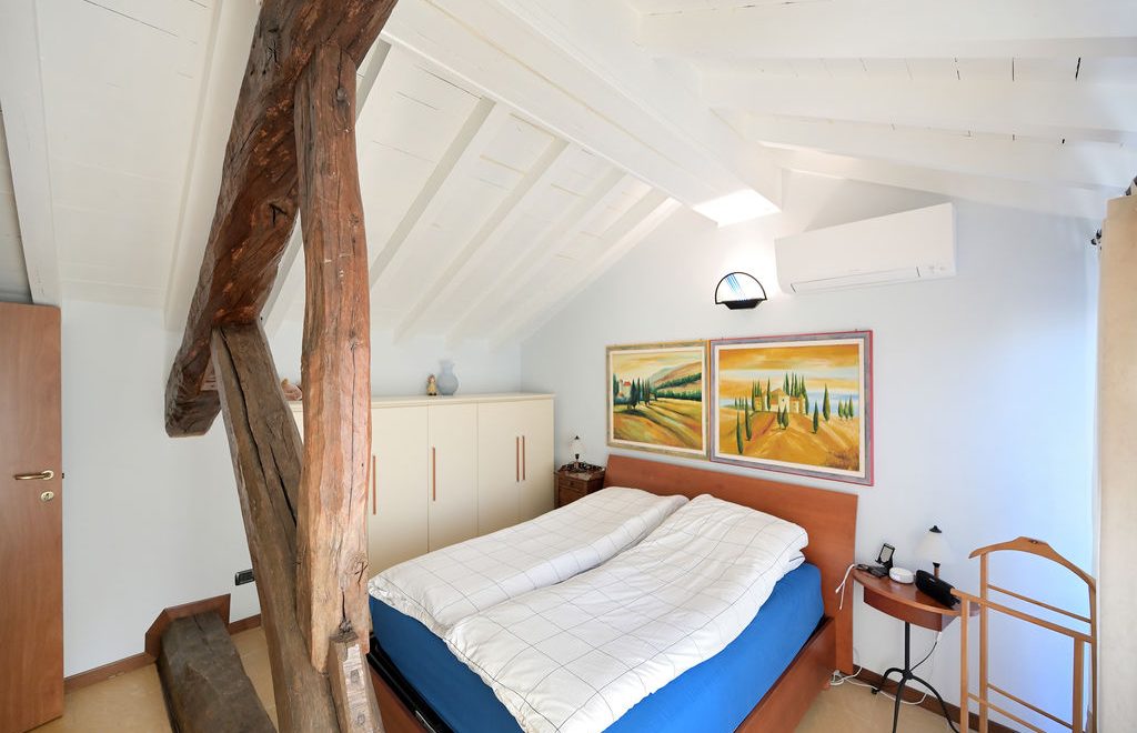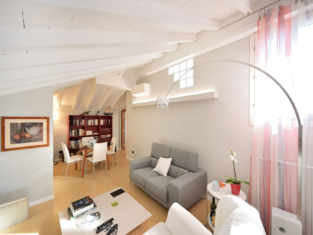 All’unità si accede attraverso un comodo ascensore vetrato che porta direttamente all’ingresso ed al grande soggiorno, caratterizzato da soffitti lignei a vista sbiancati ed accoglie, oltre alla zona living con divani, poltrone e TV anche un tavolo da pranzo.