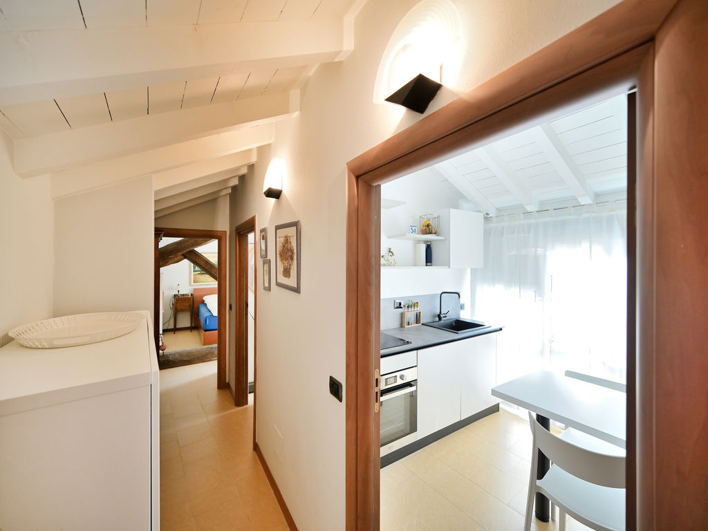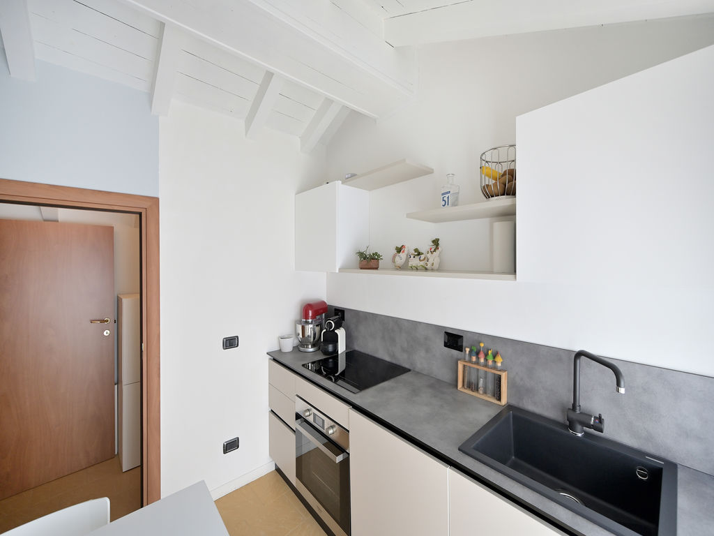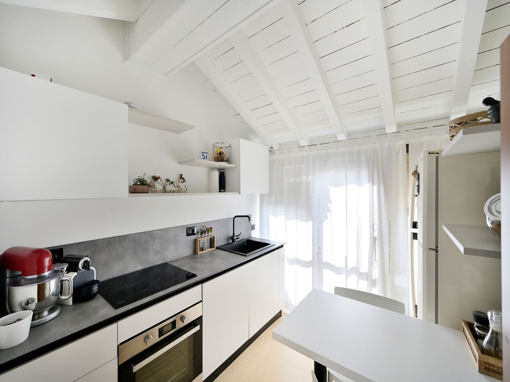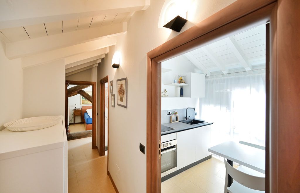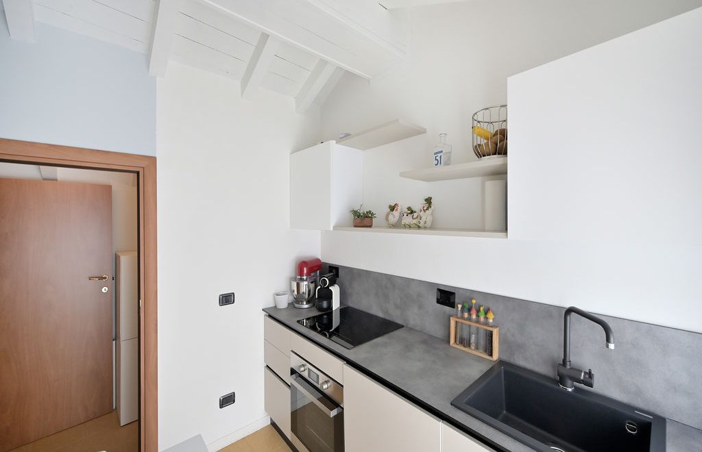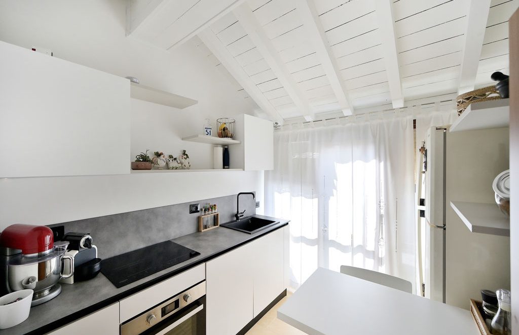 Attraverso il disimpegno si accede alla cucina, vivibile, moderna e molto luminosa con uscita diretta verso il grande terrazzo.