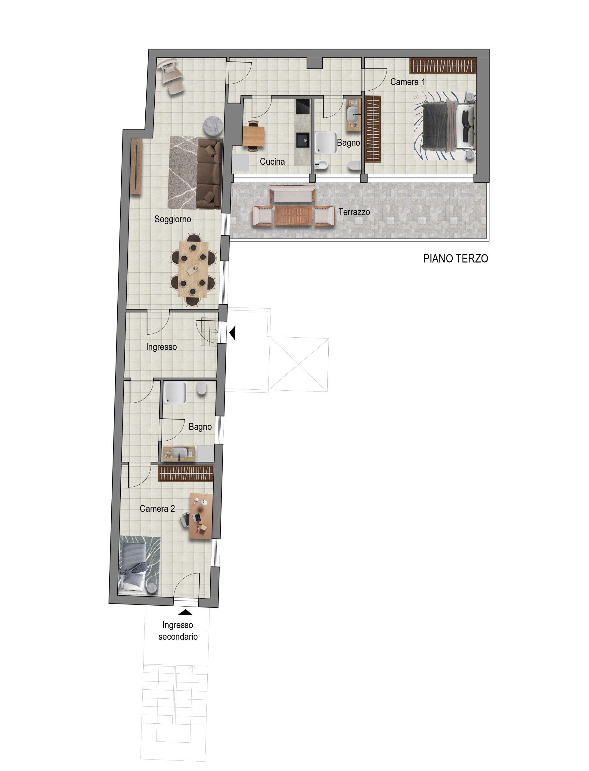 Vi è la presenza di due camere da letto dalle grandi dimensioni, entrambe potenzialmente matrimoniali e due bagni, entrambi finestrati e completi anche con una zona lavanderia.