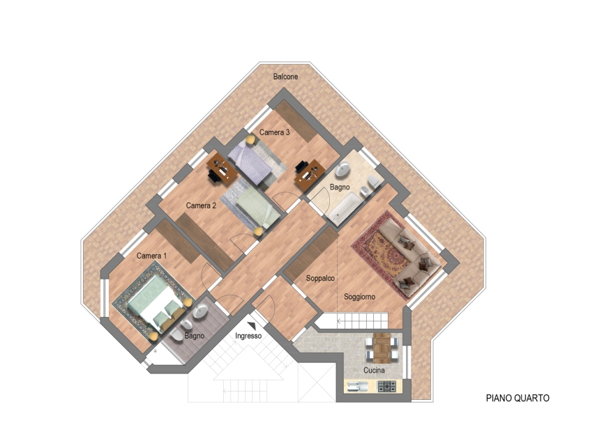 Nella zona notte si accede attraverso un corridoio di distribuzione che accoglie grandi armadiature. Le camere, tre, hanno tutte altezze elevate, grandi finestre e porte-finestre con accesso diretto sui terrazzi.