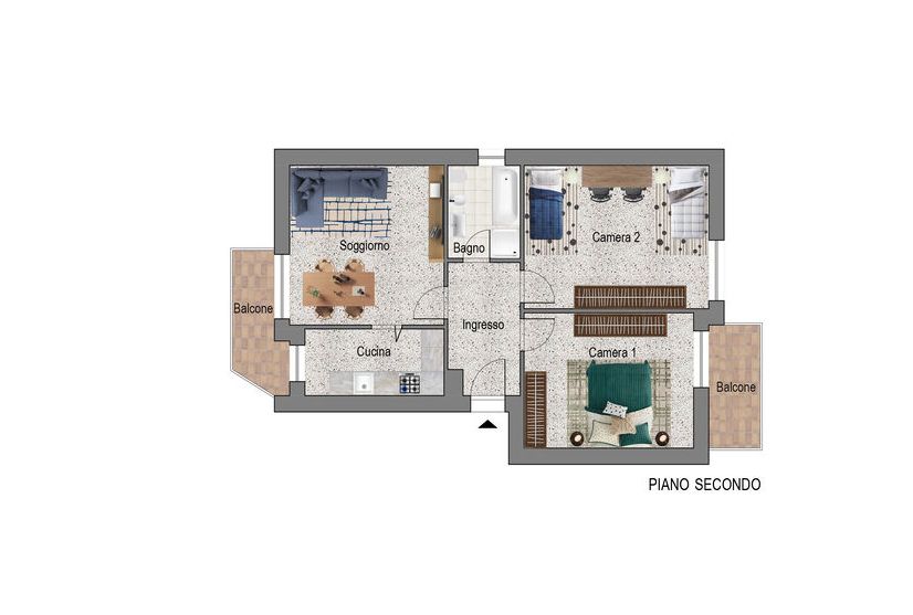 L’unità si compone di un ingresso con armadi e guardaroba a muro, un grande soggiorno che accoglie il tavolo da pranzo, il divano e la TV oltre ad un comodo balcone.
