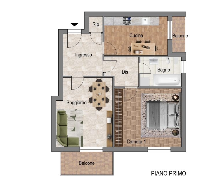 All’unità si accede attraverso un ampio ingresso con ripostiglio, il quale gestisce l’ambiente soggiorno, ampio con tavolo da pranzo, divano, TV e balcone vivibile e la cucina, anch’essa di ottime dimensioni, abitabile e con un balcone di servizio.