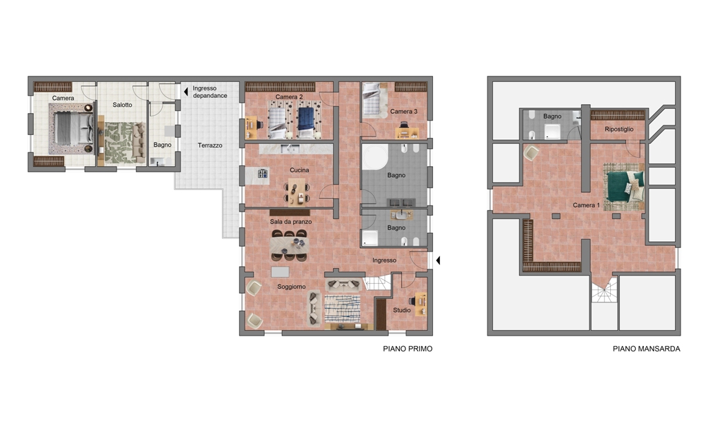 Completa il piano primo una piccola dependance direttamente collegata alla residenza principale attraverso il terrazzo, costituita da due locali e altro bagno.