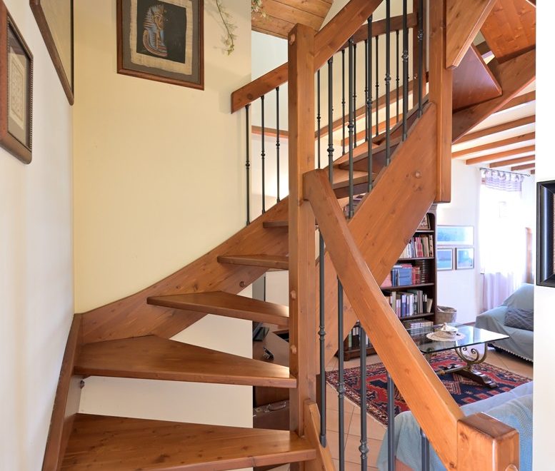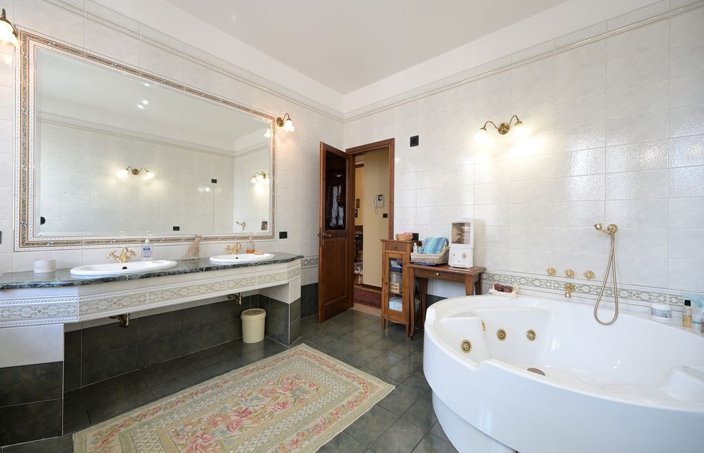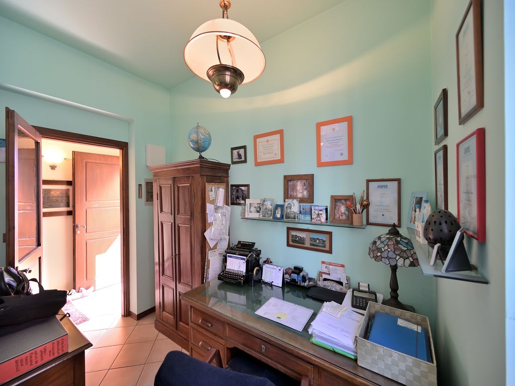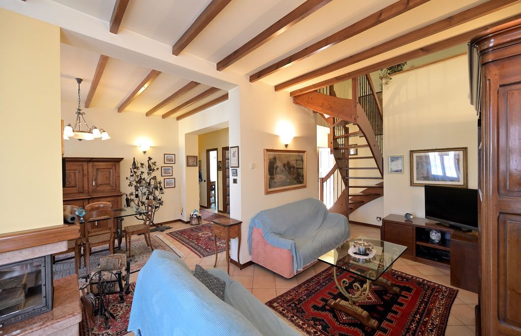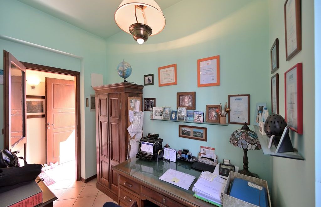 L’appartamento del primo piano si presenta in ottime condizioni ed è costituito da un grande e luminoso soggiorno con camino e doppio affaccio e scala di collegamento alla mansarda, cucina abitabile dalla quale si raggiunge il terrazzo, due ampie camere da letto, una sala da bagno con doppia vasca idromassaggio angolare e doppio lavabo, un secondo bagno con doccia e un altro locale uso studio/cameretta.